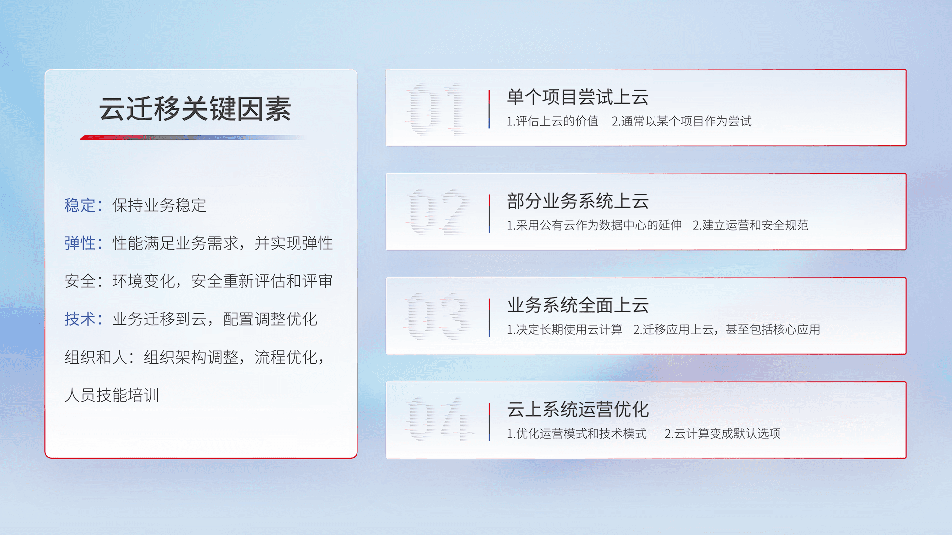 结合实际业务,,从规划设计、、、、云平台选型、、、、云原生改造、、、数据迁移、、集成交付,,迁移全过程为客户识别最佳上云路径,,做好风险识别管理,,,设计网络架构、、、身份权限、、安全审计合规、、、、操作审计、、、日志审计、、、、监控告警策略、、、、多站点容灾设计等,,,,对云上基础设施进行整体规划,,,,提升IT治理水平,,,以满足弹性、、高可用、、、高性能的需求。。