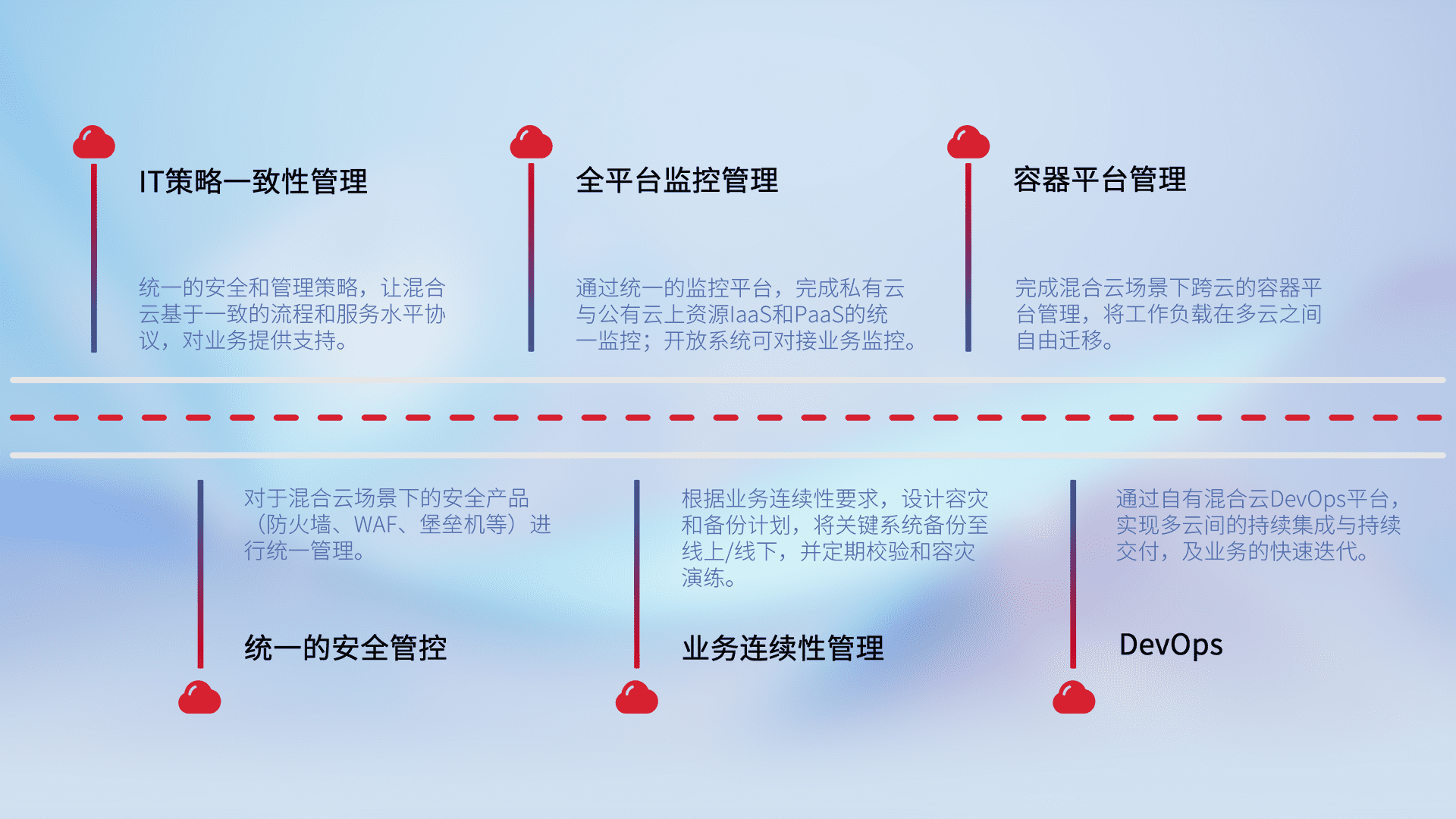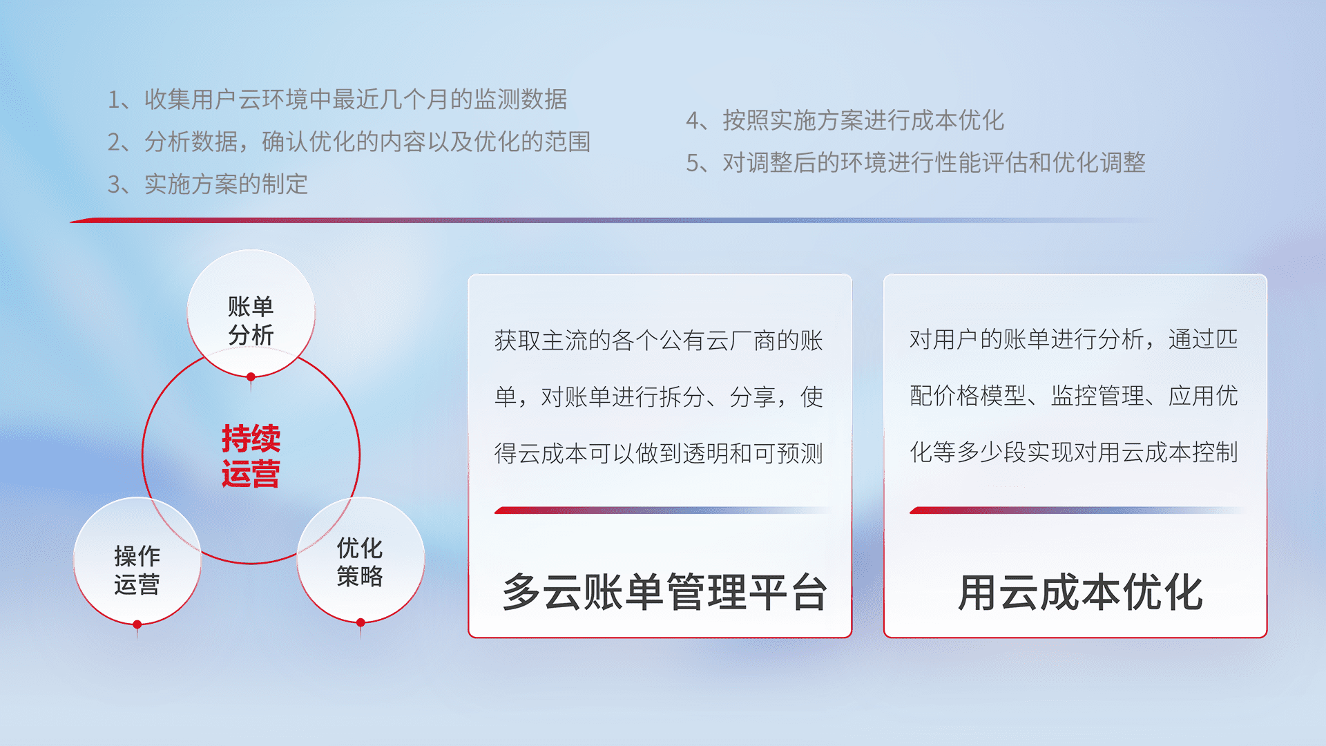 通过多云纳管,,,,以统一的资源数据模型把客户的云资源进行抽象和封装,,,进而实现对多云资源的统一操作,,,,保障云资源管理的可靠性、、、稳定性与可用性。。。量身定制化运维内容,,,,配置、、、、开发运维、、、、补丁管理、、、、备份、、监控、、认证和访问管理、、、、审计和日常巡检等,,保障在用云过程中的可靠度,,稳定度以及高可用率。。