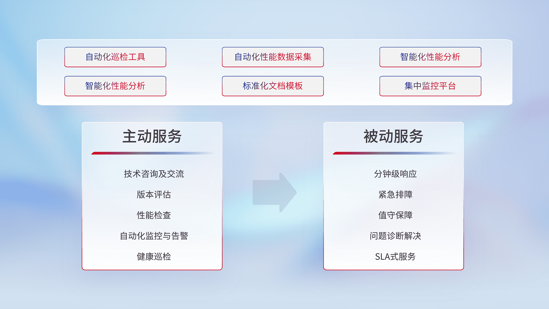 智能化工具和标准化文档,,,,保障服务质量,,,提供主动服务(包含技术咨询、、、版本评估、、、性能检查、、、、自动化监控与告警、、健康巡检)和被动服务包含(分钟级响应、、、紧急排障、、、、值守保障、、、、问题诊断解决、、、SLA服务)。。。